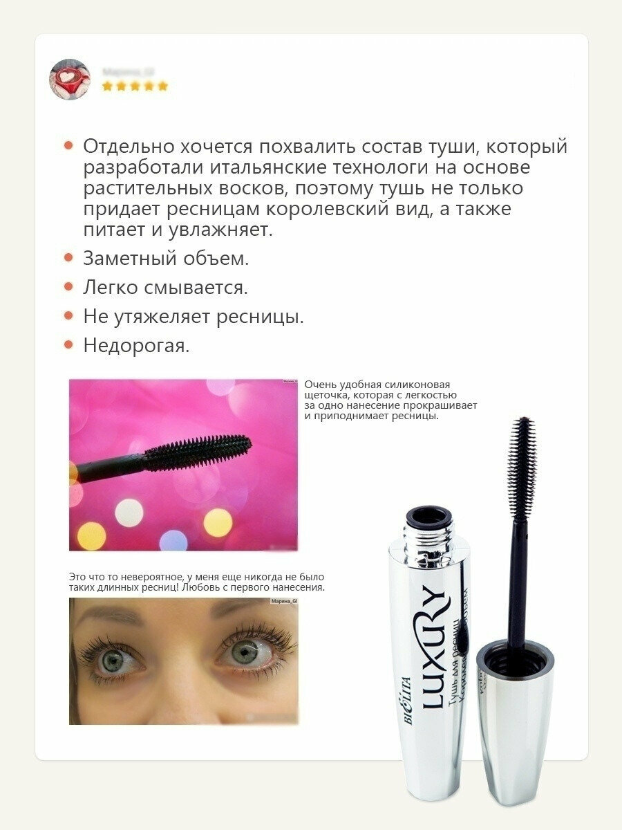 Ниже Вы можете прочитать отзывы на BELITA Luxury Тушь для ресниц Королевский объем, 12мл. (фут серебро), ознакомится с подробными характеристиками, посмотреть интересные обзоры и фотографии на BELITA Luxury Тушь для ресниц Королевский объем, 12мл. (фут серебро).