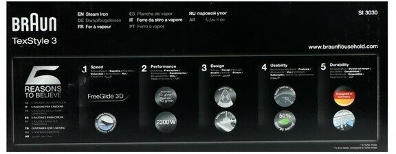 | Отзыв: | Braun SI3030 – паровой утюг с керамической подошвой SuperCeramic FreeGlide 3D, паровым ударом, функцией постоянной подачи пара и защитой от накипи. Нагревается этот утюг быстро, к тому же у него длинный шнур, поэтому вам будет удобно гладить, даже если доска установлена довольно далеко от розетки. Однако регулировать температуру не очень удобно, так как термостат при переключении может скользить. Ручка изготовлена из специального пластика для большего удобства, но она все равно может скользить. Заливать воду в резервуар и выливать ее будет удобно, но он не очень легко открывается. Сквозь фиолетовый пластик хорошо видно, сколько воды осталось в резервуаре. Подошва утюга гладкая, однако она слишком толстая, и вам, скорее всего, будет неудобно гладить ткань вокруг пуговиц, к тому же она недостаточно узкая на конце, поэтому разглаживать рубашки или блузки будет тоже неудобно. Этот утюг очень хорошо гладит одежду из синтетических тканей, а вот с хлопком и джинсами он справится хуже, поэтому для разглаживания одежды из хлопка вам придется приложить чуть больше усилий. |