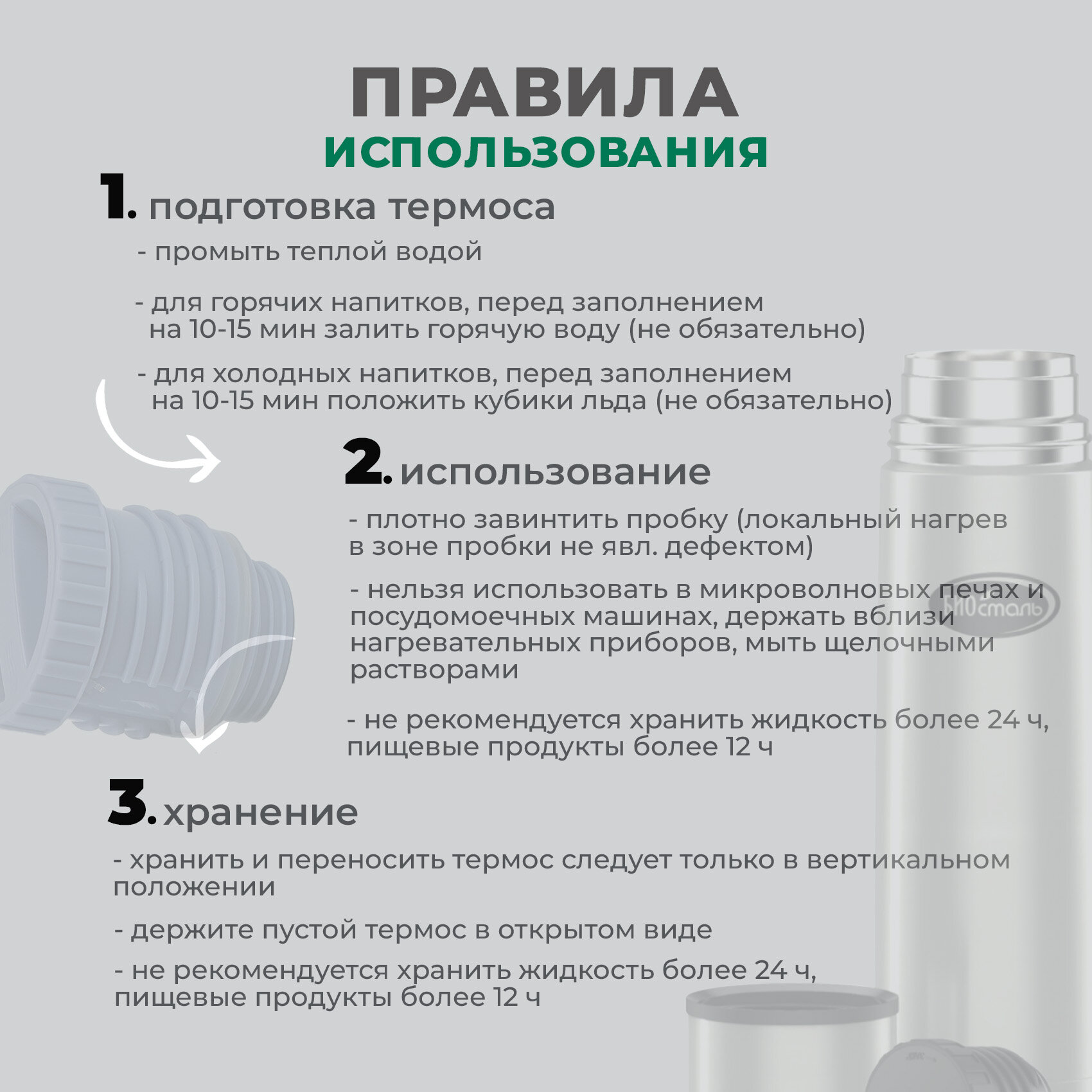 | Минусы: | Пробка сложно закручивается. Иногда даже выстреливает на 2 мм и приходится подкручивать. На дне что то вроде ржавчины появилось. Пил только чай. |