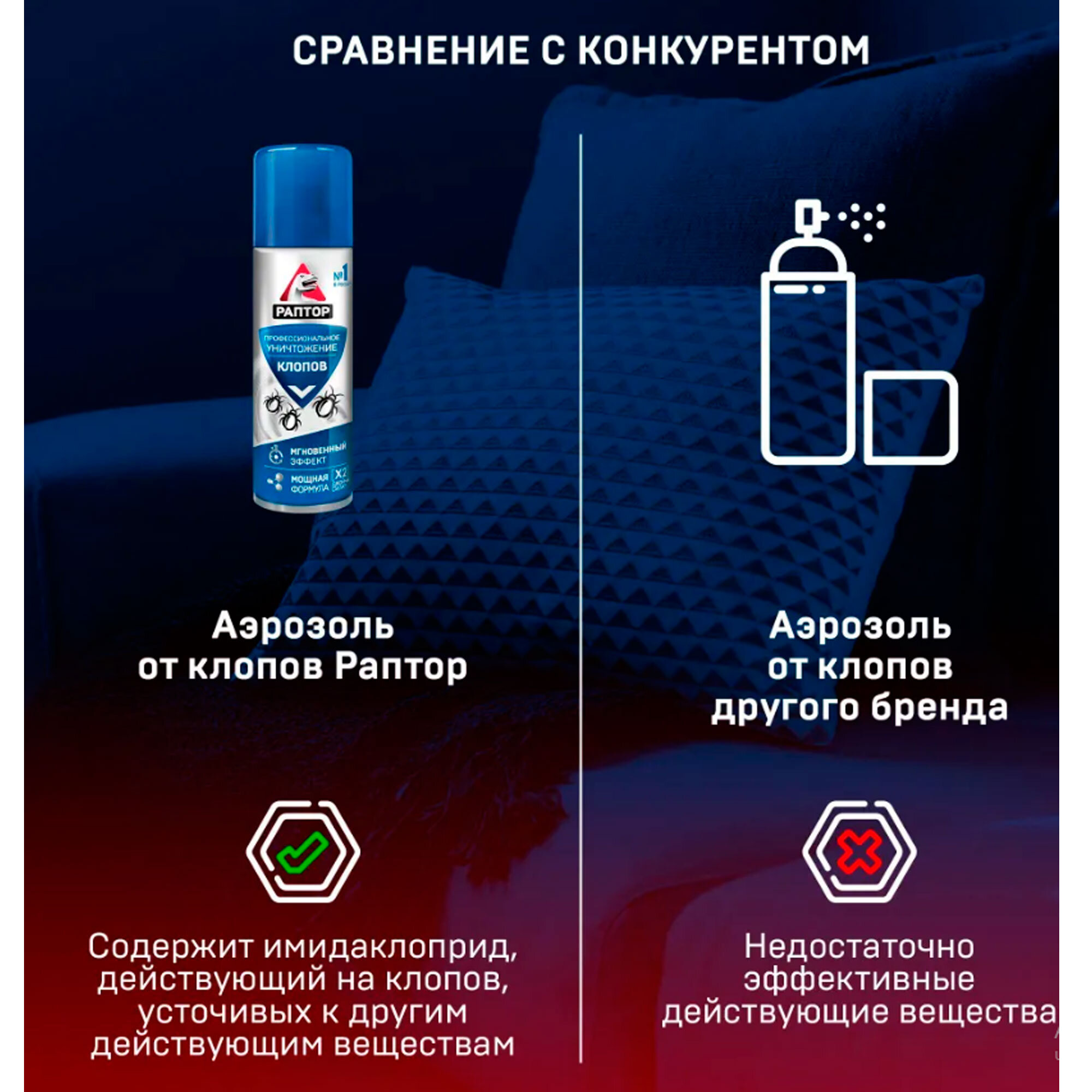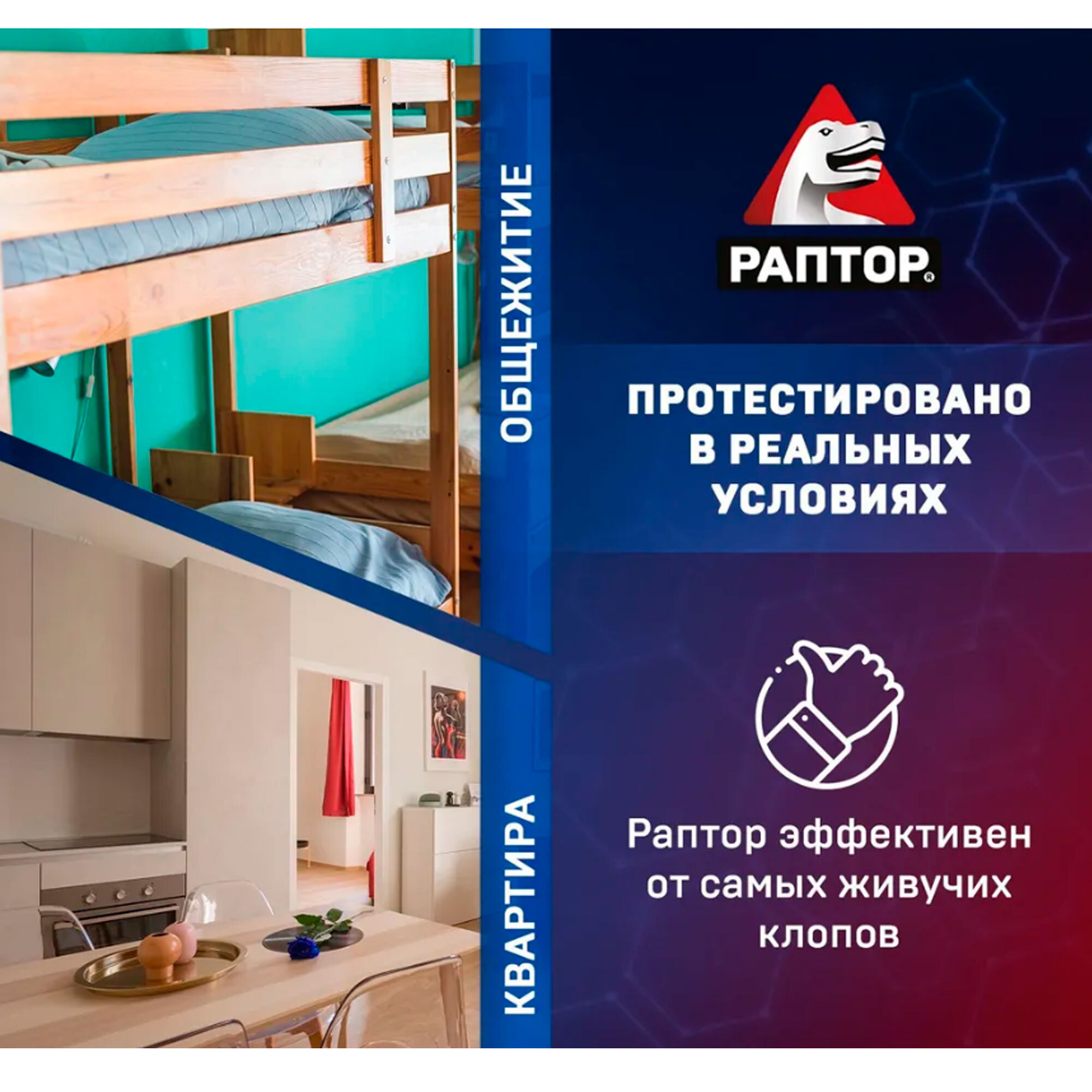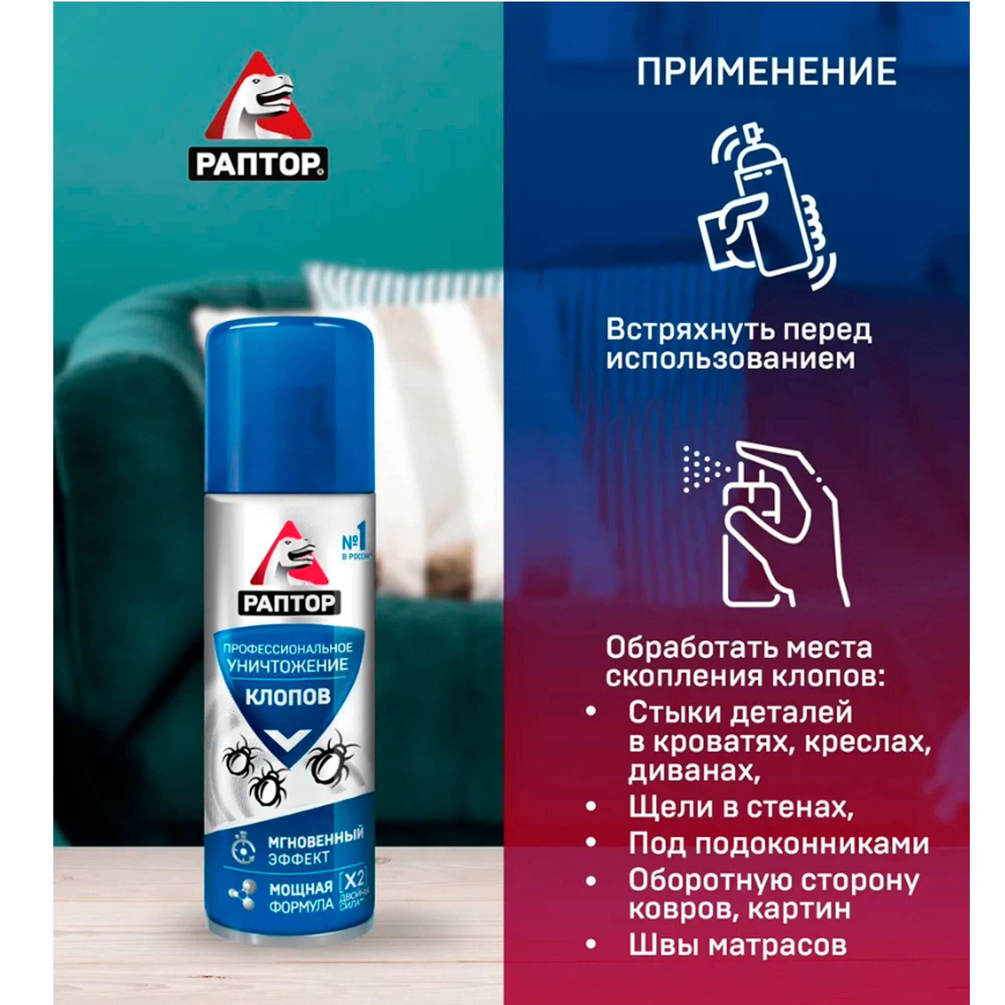 С клопами воюю не первый месяц разными средствами. Раптор от клопов по сравнению с другими какое-то прям убойное средство. Набрызгала всю мягкую мебель и по комнате чуть-чуть прошлась. В общем после этого клопов нет, отличный результат на мой взгляд. Через недельку процедуру повторю для закрепа, а то клопы умеют хитро прятаться.