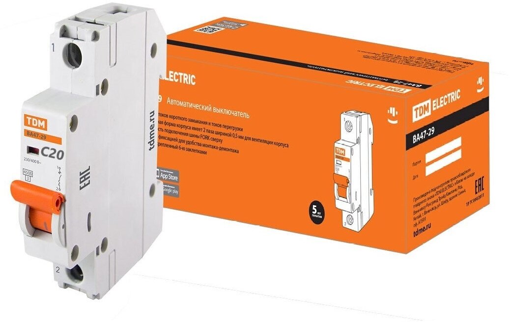 Выключатель автоматический 1-пол. (1P) 20А C 4.5кА ВА47-29 TDM ELECTRIC