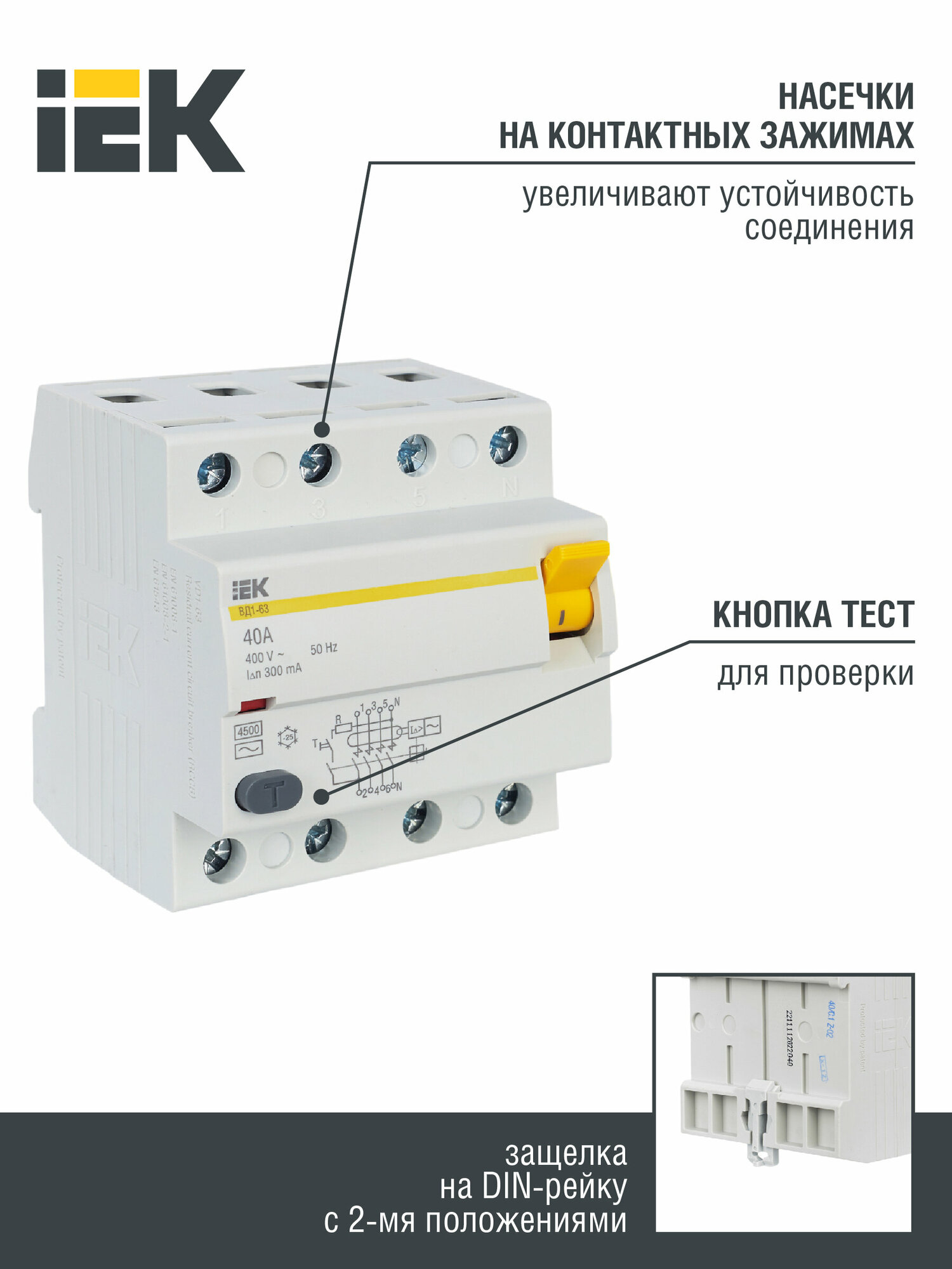УЗО рейка DIN iEK ВД1-63 4п 40А 300мА 400В