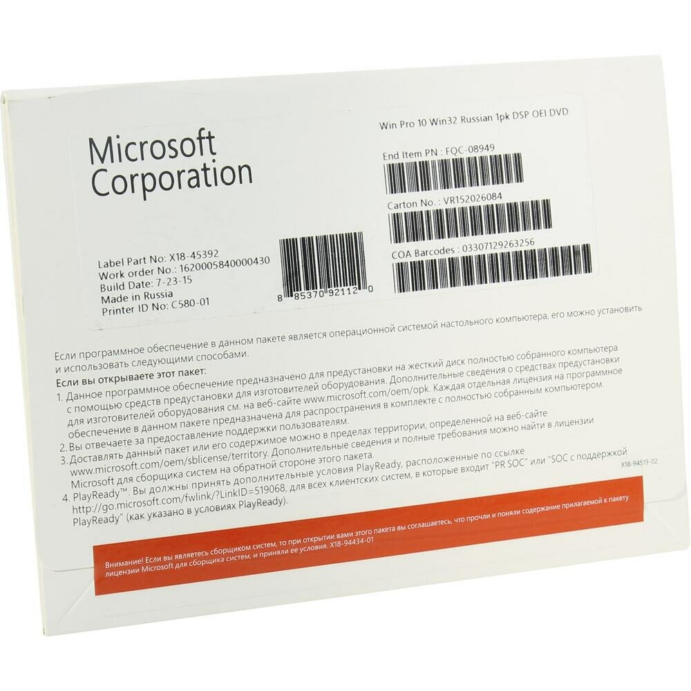 Microsoft Windows 10 Professional 64-bit DSP OEI для сборщиков систем, лицензия и носитель, DVD