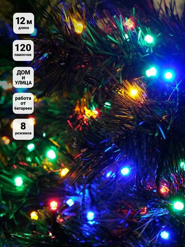 Гирлянда SHLights, 120 LED, уличная, 12м, 8 режимов мигания, на батарейках, мульти (LD120-GM-BO)