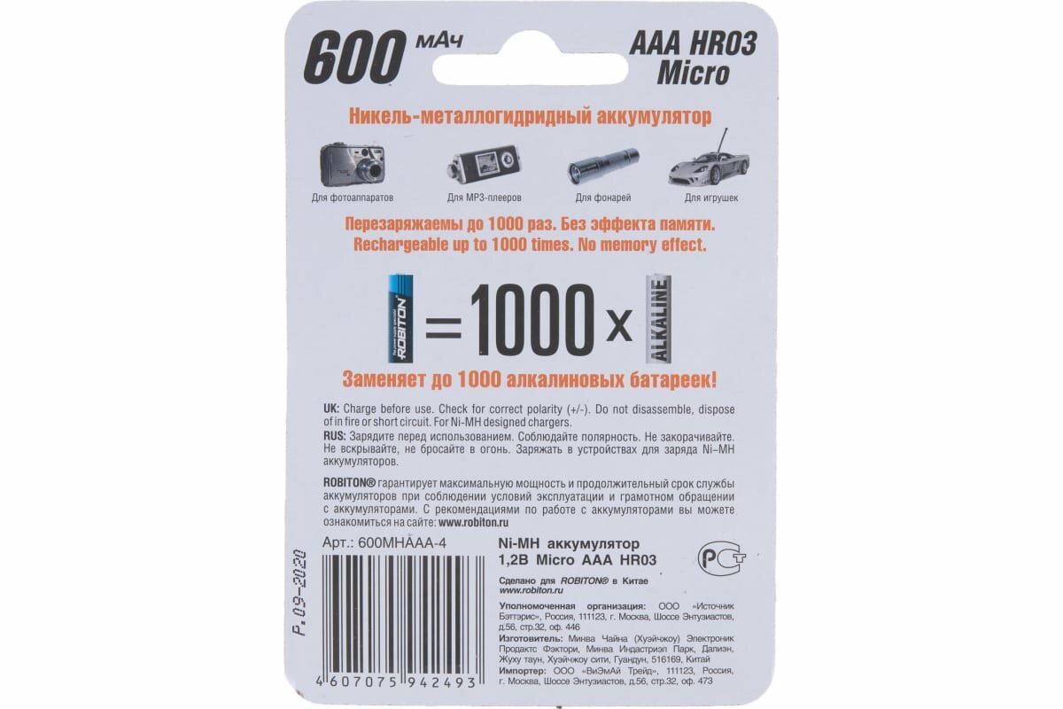 Аккумуляторы ROBITON 600MHAAA-4 BL4