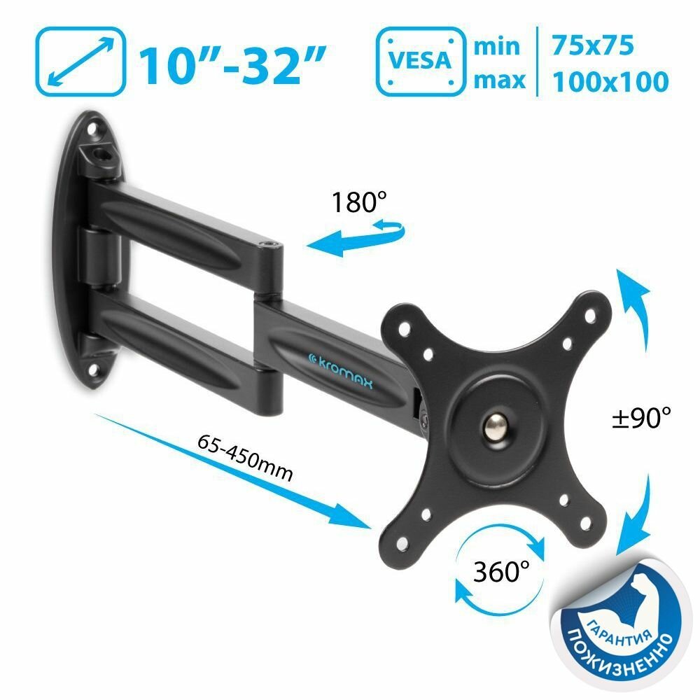 Кронштейн Kromax Techno-11 черный, для LED/LCD TV 10"-32", max 15 кг, настенный, 5 ст свободы, max VESA 100x100 мм