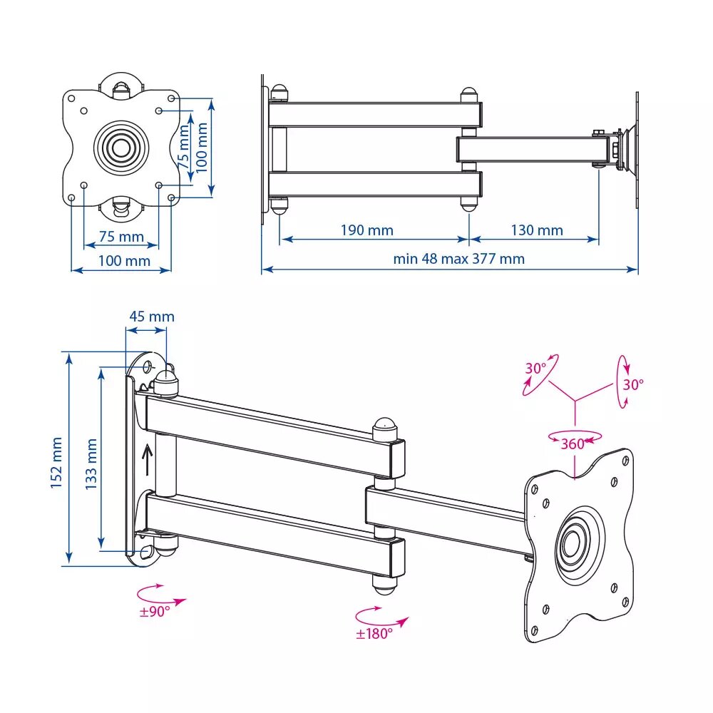 Кронштейн DIX-15, для ТВ, наклонно-поворотный, 15-28", 48-377 мм от стены, черный