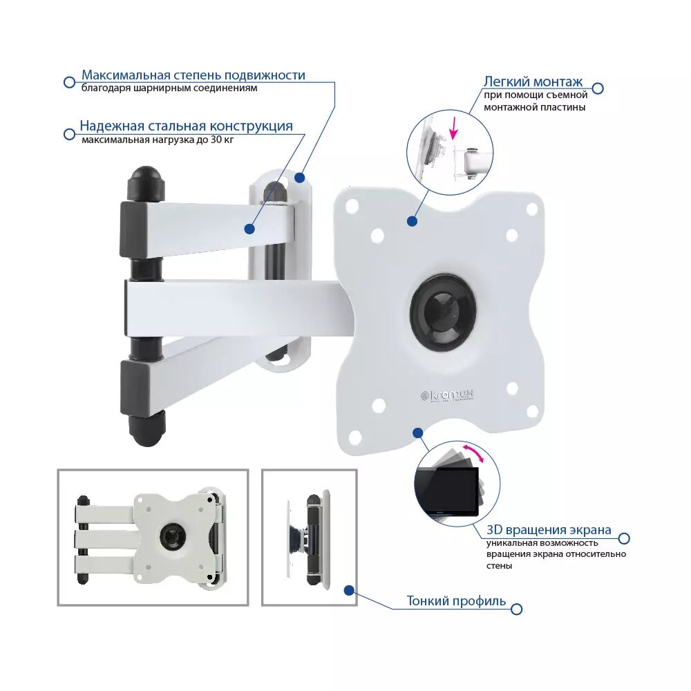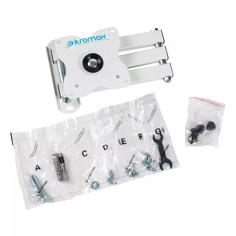 Кронштейн Kromax DIX-15 Белый, Кр. стал. наст. для TV 10"-28", max 30 кг, 5 ст св., нак. ±15°, пов. 180°, от ст. 48-377 мм, max VESA 100x100