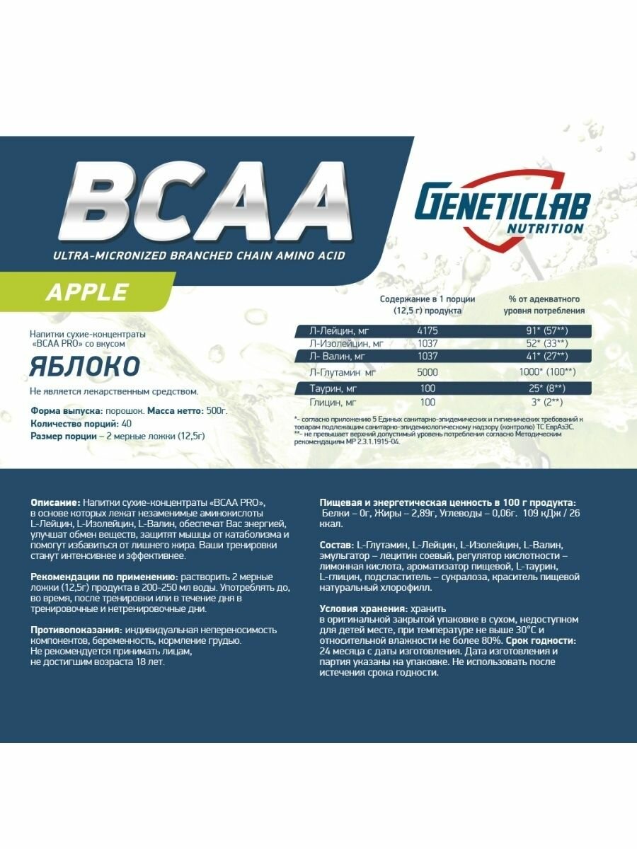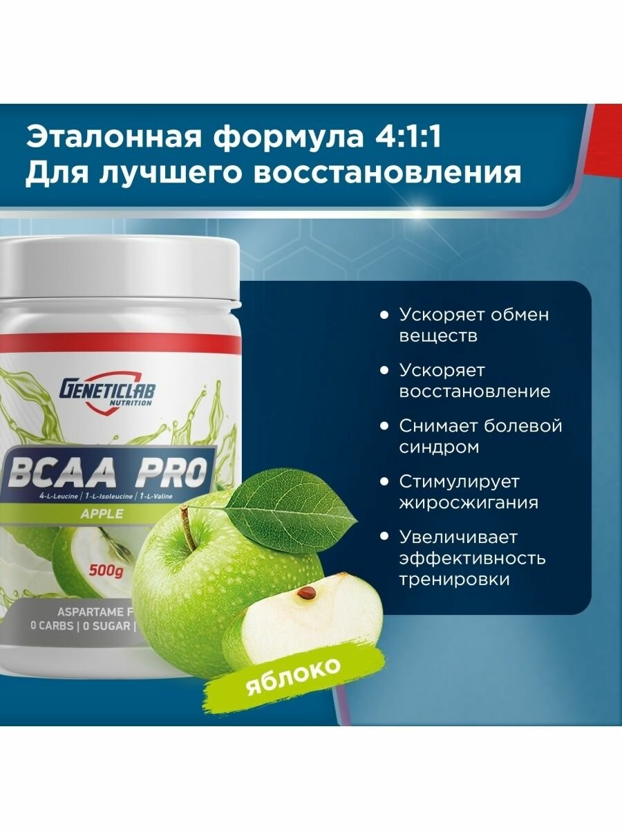 Купить Аминокислоты BCAA (БЦАА), Geneticlab Nutrition, BCAA Pro, 500 г, Яблоко