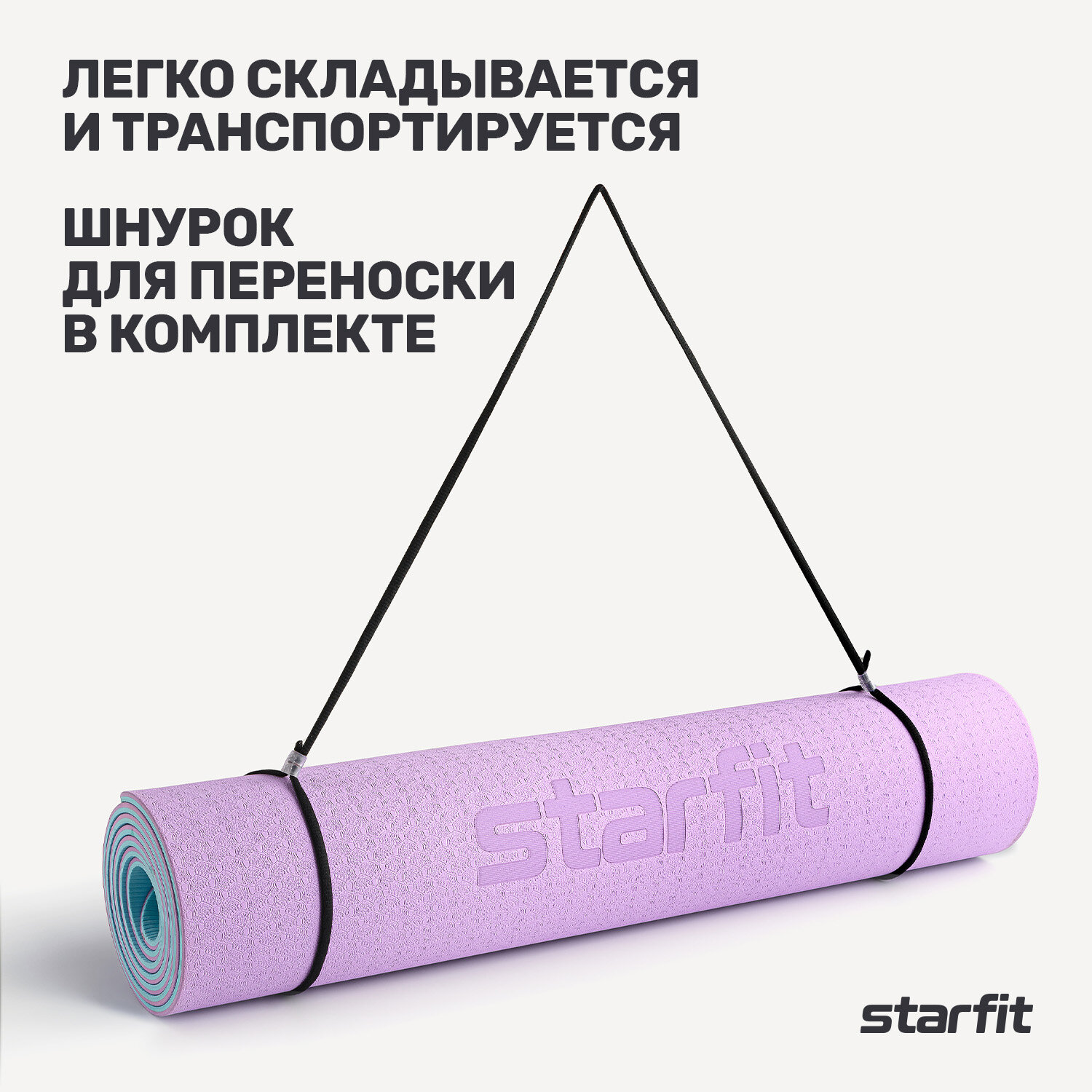 Коврик для йоги и фитнеса STARFIT FM-201, TPE, 183x61x0,6 см, фиолетовый пастель/синий пастель с шнурком для переноски