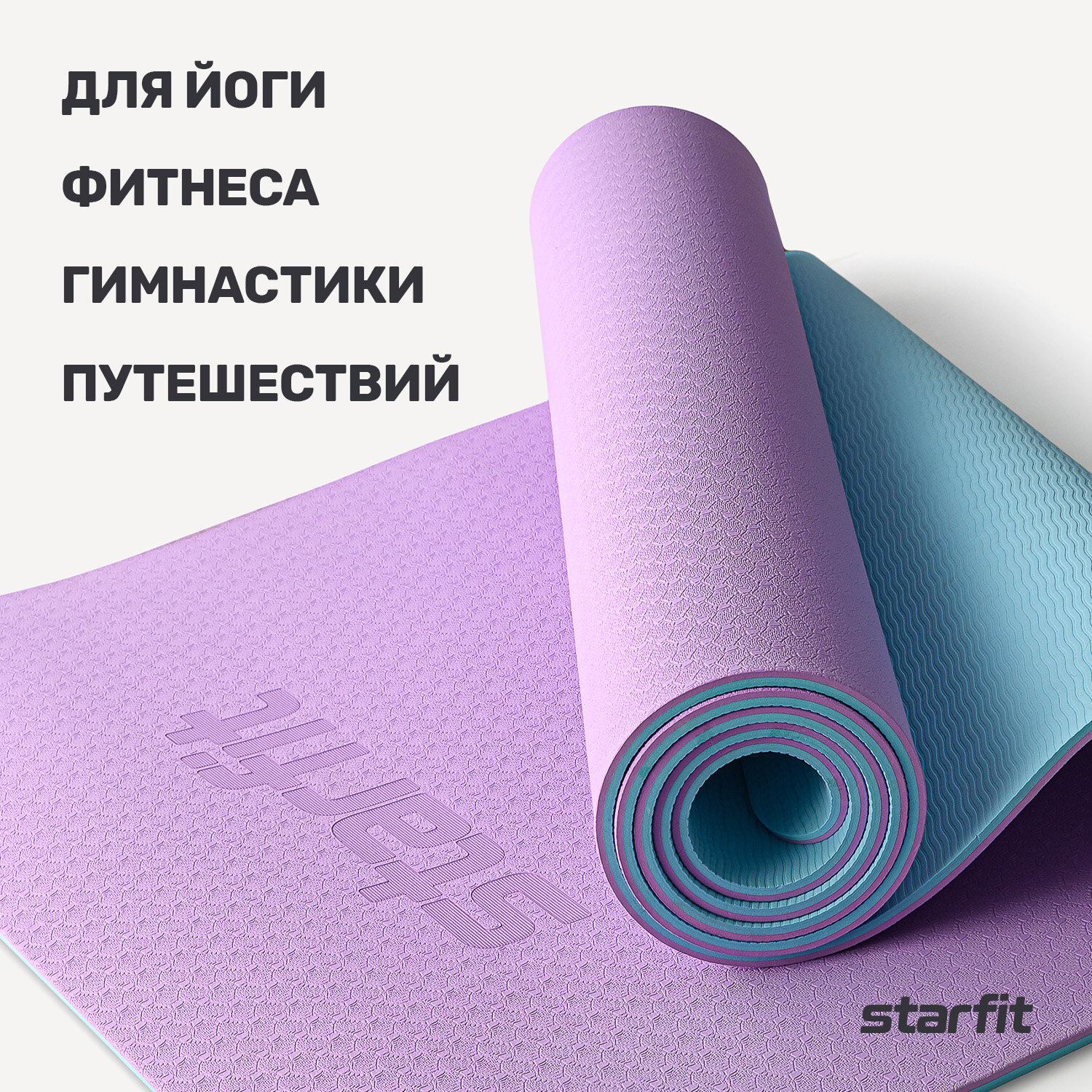 Коврик для йоги и фитнеса Starfit Fm-201, Tpe, 183x61x0,6 см, фиолетовый пастель/синий пастель