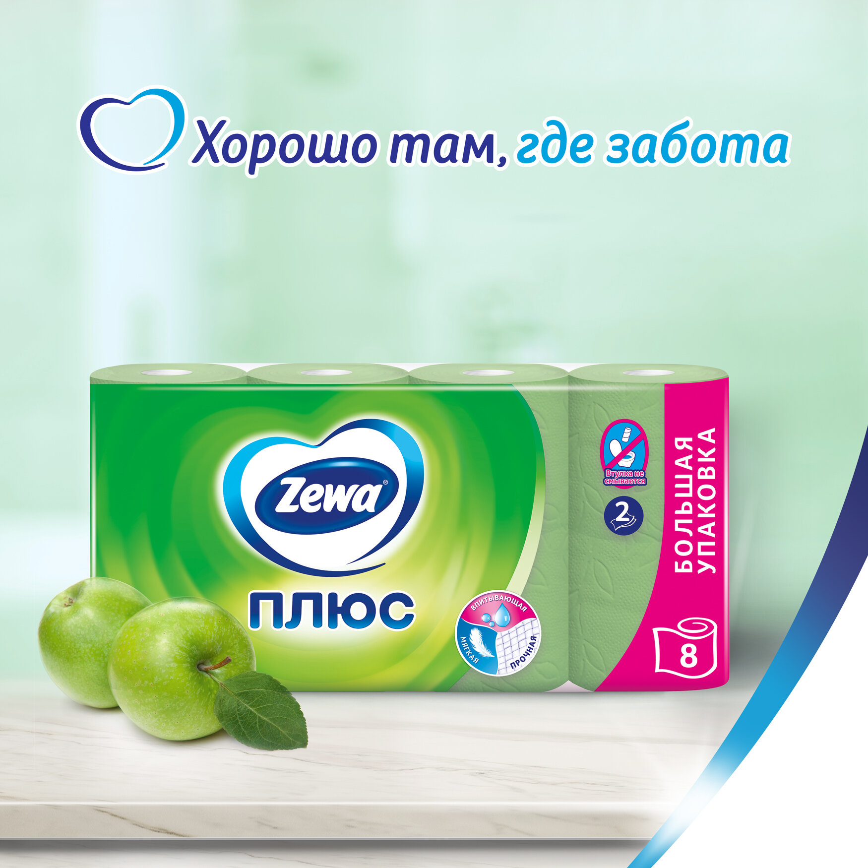 Туалетная бумага Zewa Plus яблоко зеленая, двухслойная новый дизайн, 8шт - Essity
