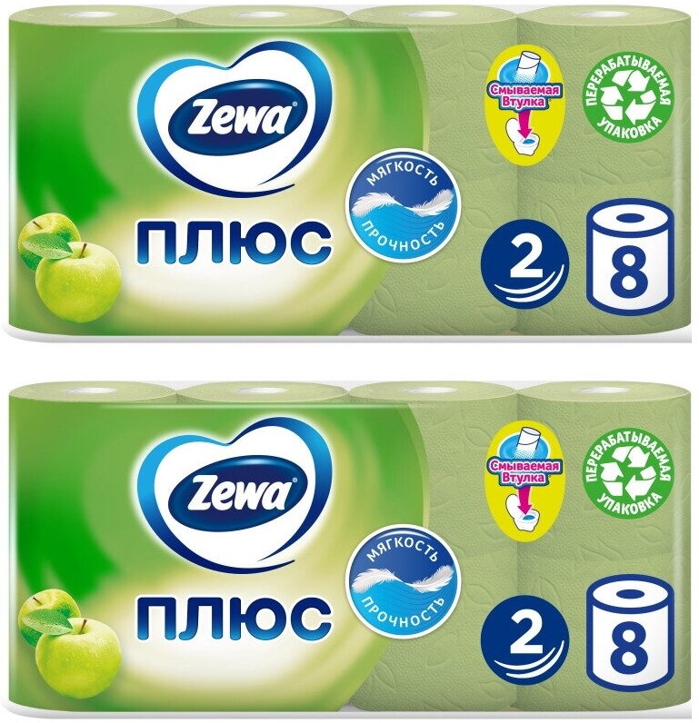 Туалетная бумага Zewa Плюс, 2-х слойная, яблоко, 8 шт, 2 уп