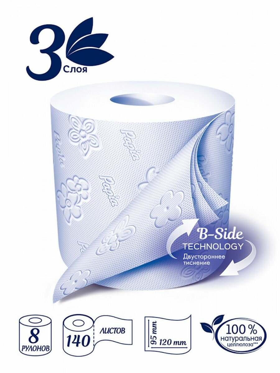 Туалетная бумага Papia белая, 3 слоя, 8 рулонов