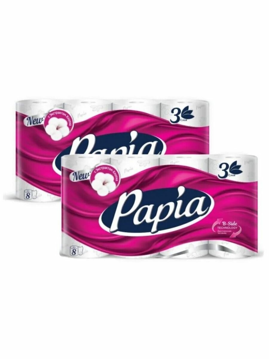 Туалетная бумага трехслойная PAPIA с экстрактом хлопка, 8 рулонов, 3 слоя / Папиа