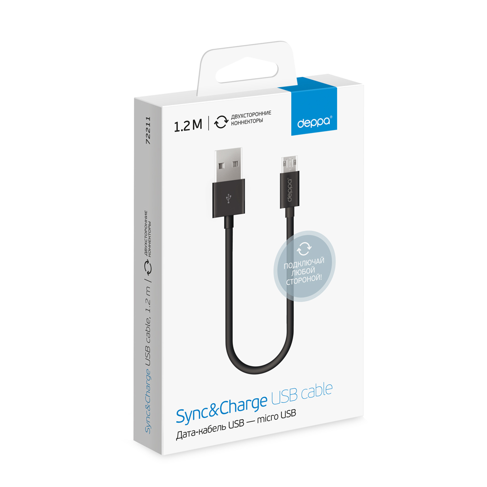 Дата-кабель Deppa USB - micro USB с двухсторонними коннекторами, 1.2 м (черный)