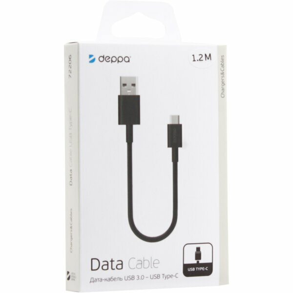 72206, Кабель Deppa USB A - USB Type-C, USB 3.0, 1.2м, черный