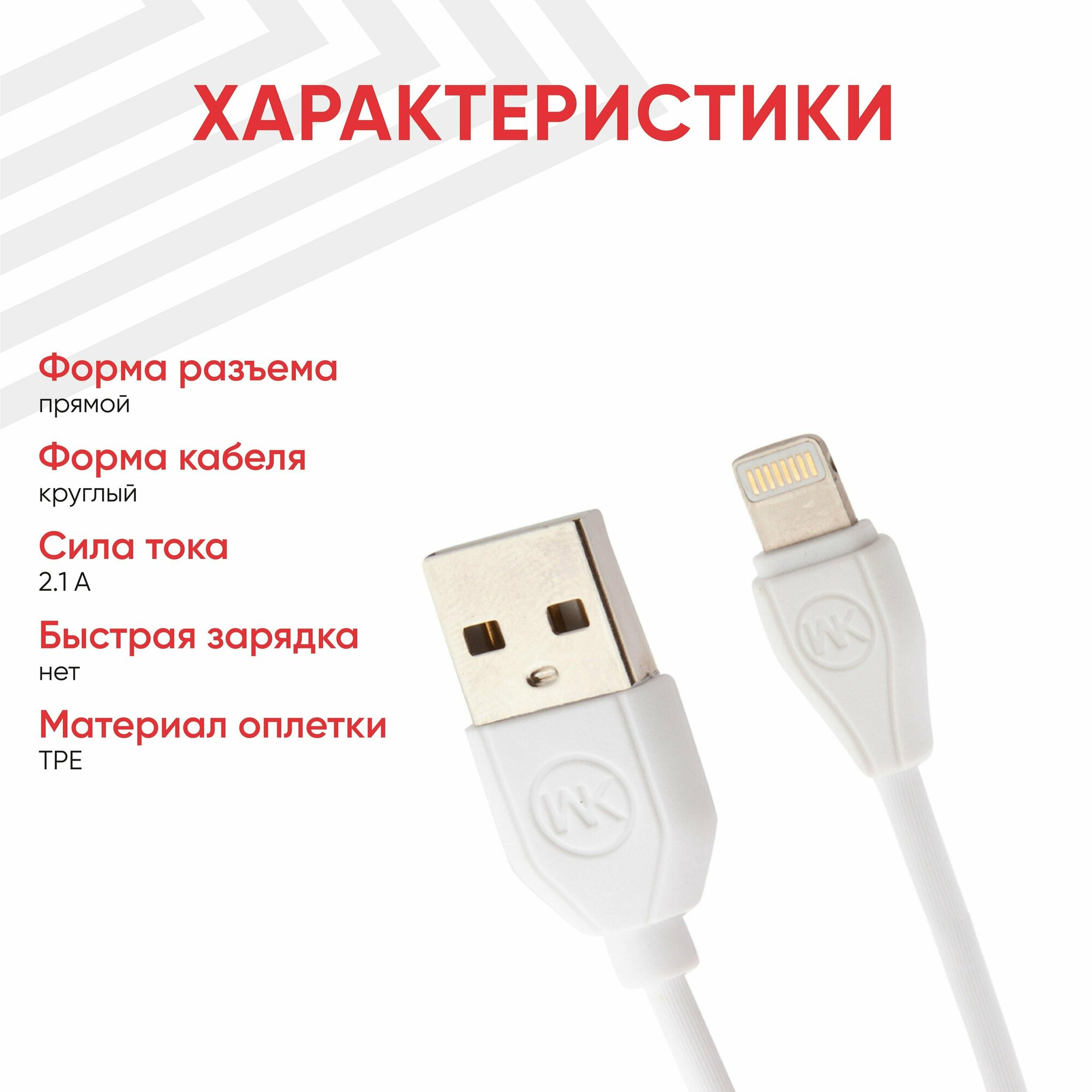 USB кабель для мобильных устройств WK RC-050i для зарядки, передачи данных, Lightning 8-pin, 2.1А, 1м, TPE, белый