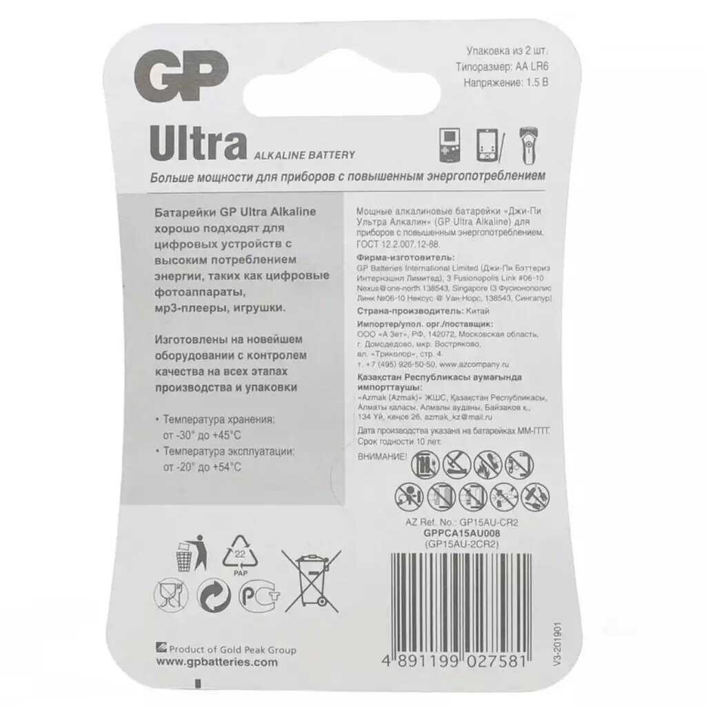 GP Ultra 15AU-CR2 (lr6) Size AA, щелочной (alkaline) (уп. 2 шт)