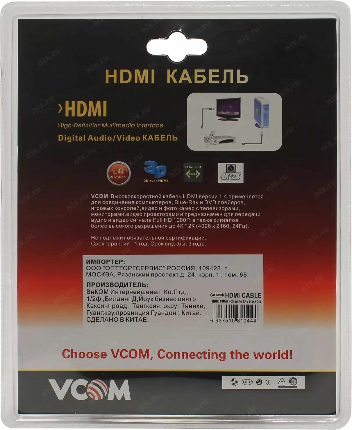 Купить Кабель VCOM VHD6020D-5MB Кабель HDMI 19M/ M ver:1.4+3D, 5m, позолоченные контакты, 2 фильтра Blister