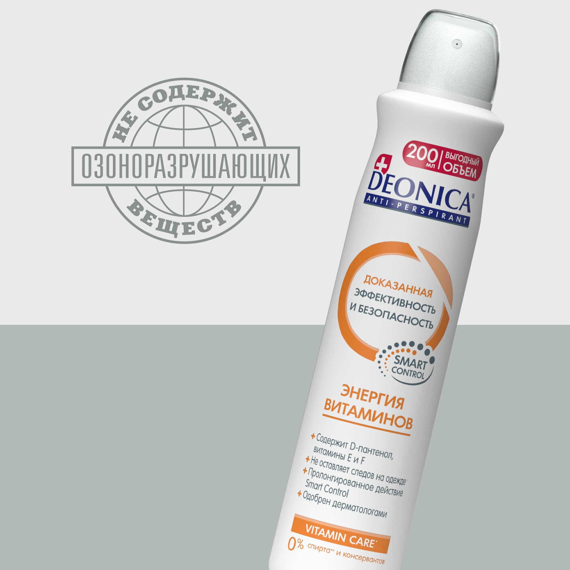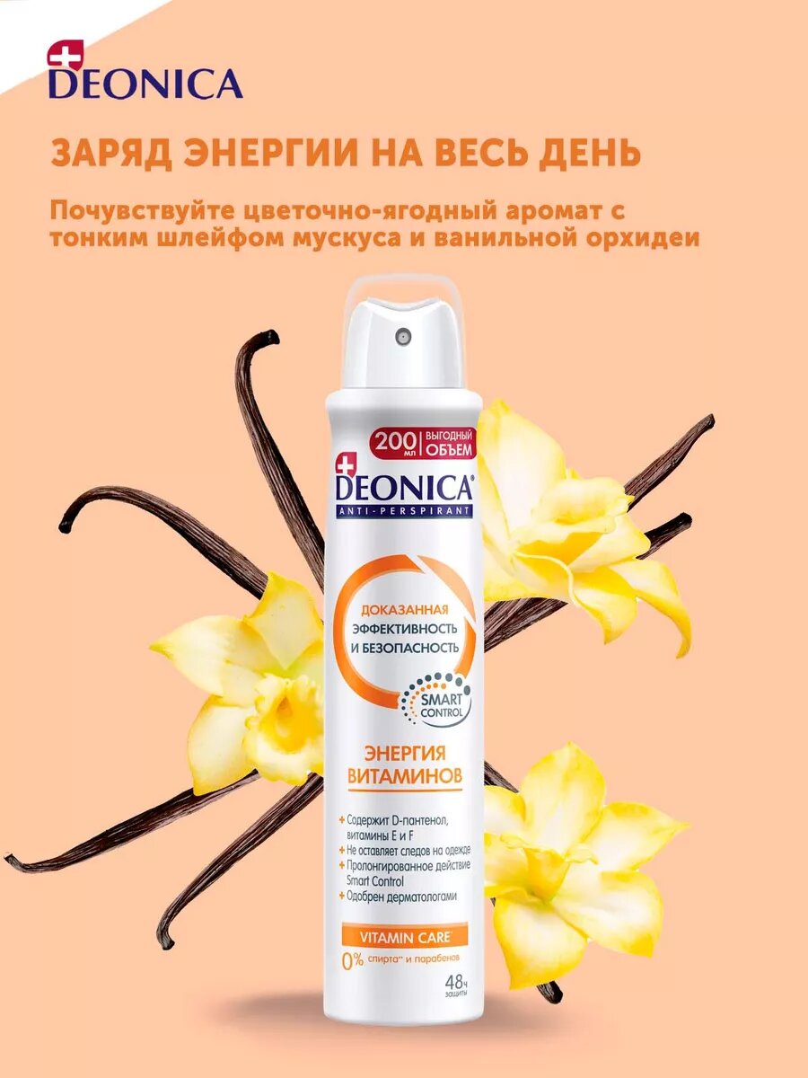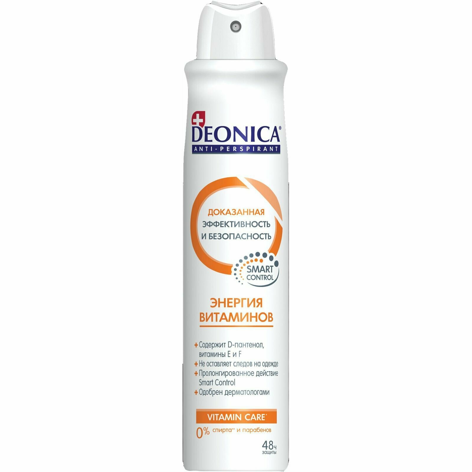 Дезодорант женский антиперспирант Deonica "Энергия витаминов". Спрей, 200 мл. С комплексом витаминов F, E и D-пантенолом. Не оставлет следов на одежде