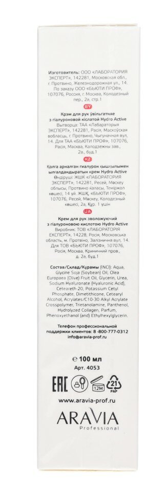 Крем ARAVIA PROFESSIONAL для рук увлажняющий Hydro Active с гиалуроновой кислотой, 100 мл