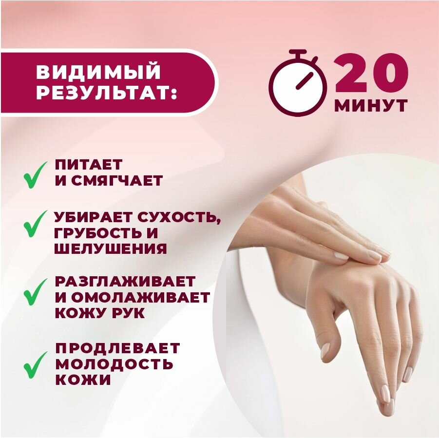 | Плюсы: | Хорошо увлажняет, нейтральный запах, перчатки не запаяны (как часто бывает у тканевых масок для рук), т.е. не нужны ножницы чтобы их открыть. |