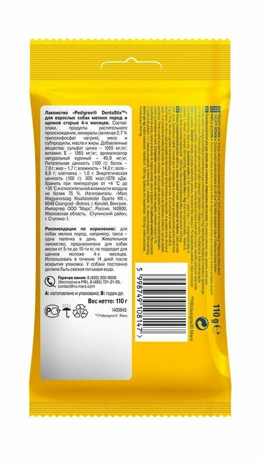 Лакомство для собак мелких пород Pedigree Denta Stix (4шт по 110г)