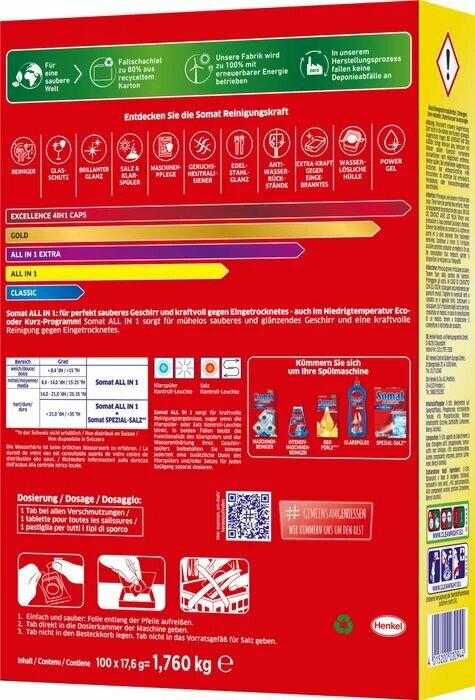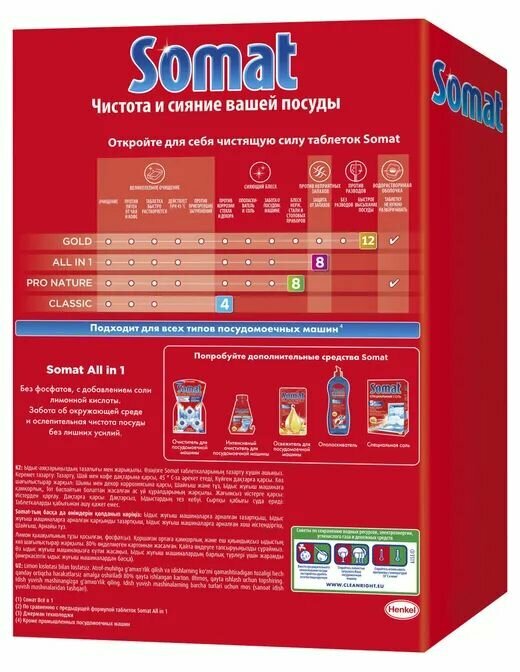 | Комплектация | Somat All in 1 Таблетки для посудомоечной машины, 100 шт., коробка |