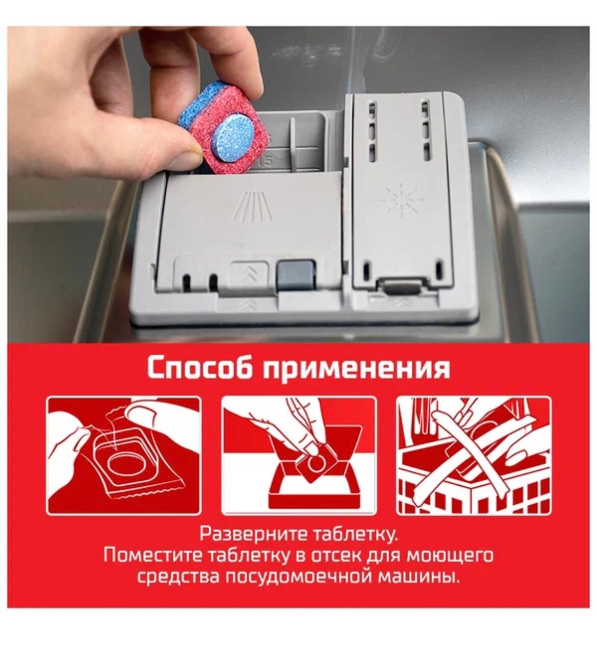| Способ применения | Загрузите посуду в посудомоечную машину. Положите таблетку в отсек для моющего средства посудомоечной машины. Запустите моющий режим посудомоечной машины. Не водорастворимая оболочка таблетки, оболочку надо снимать |