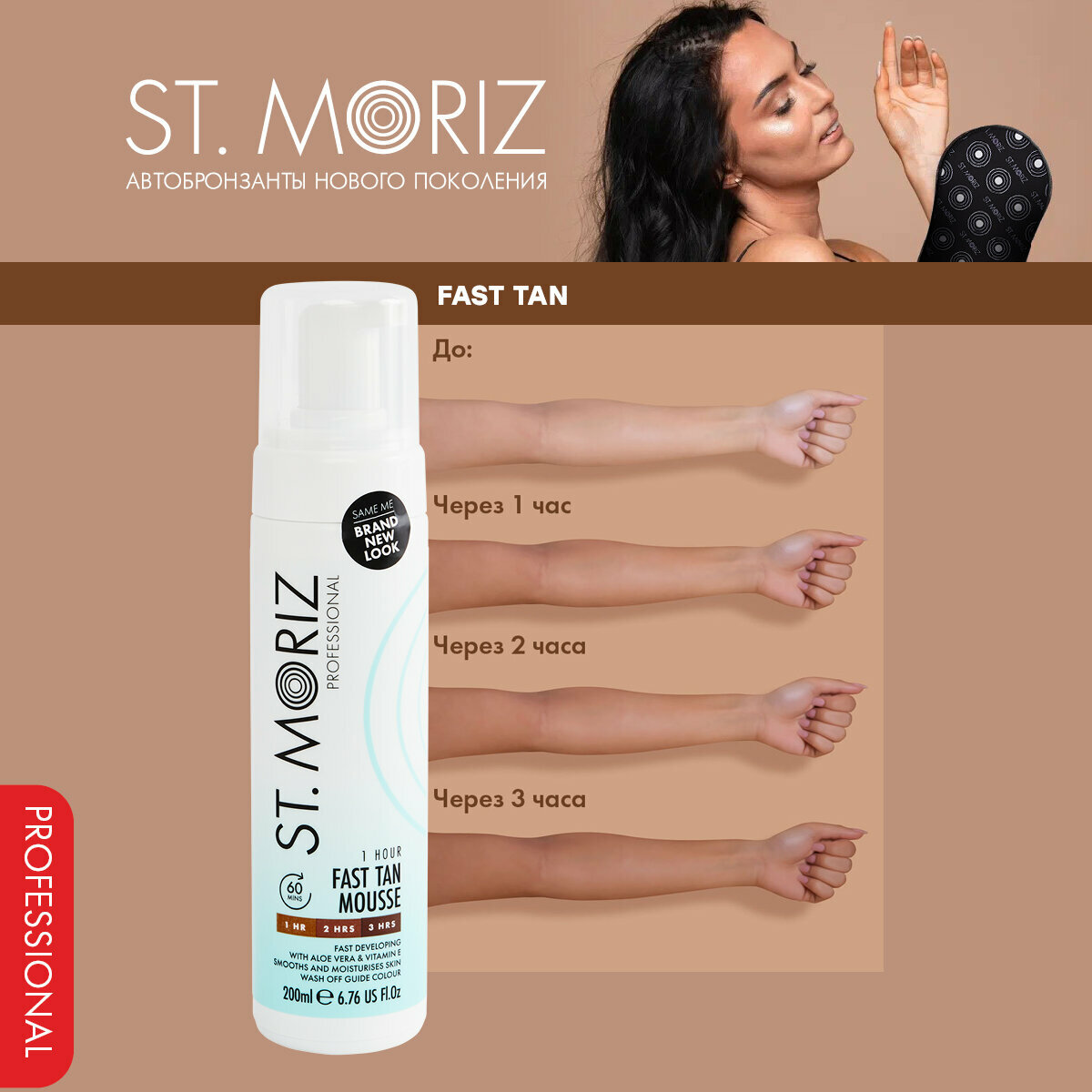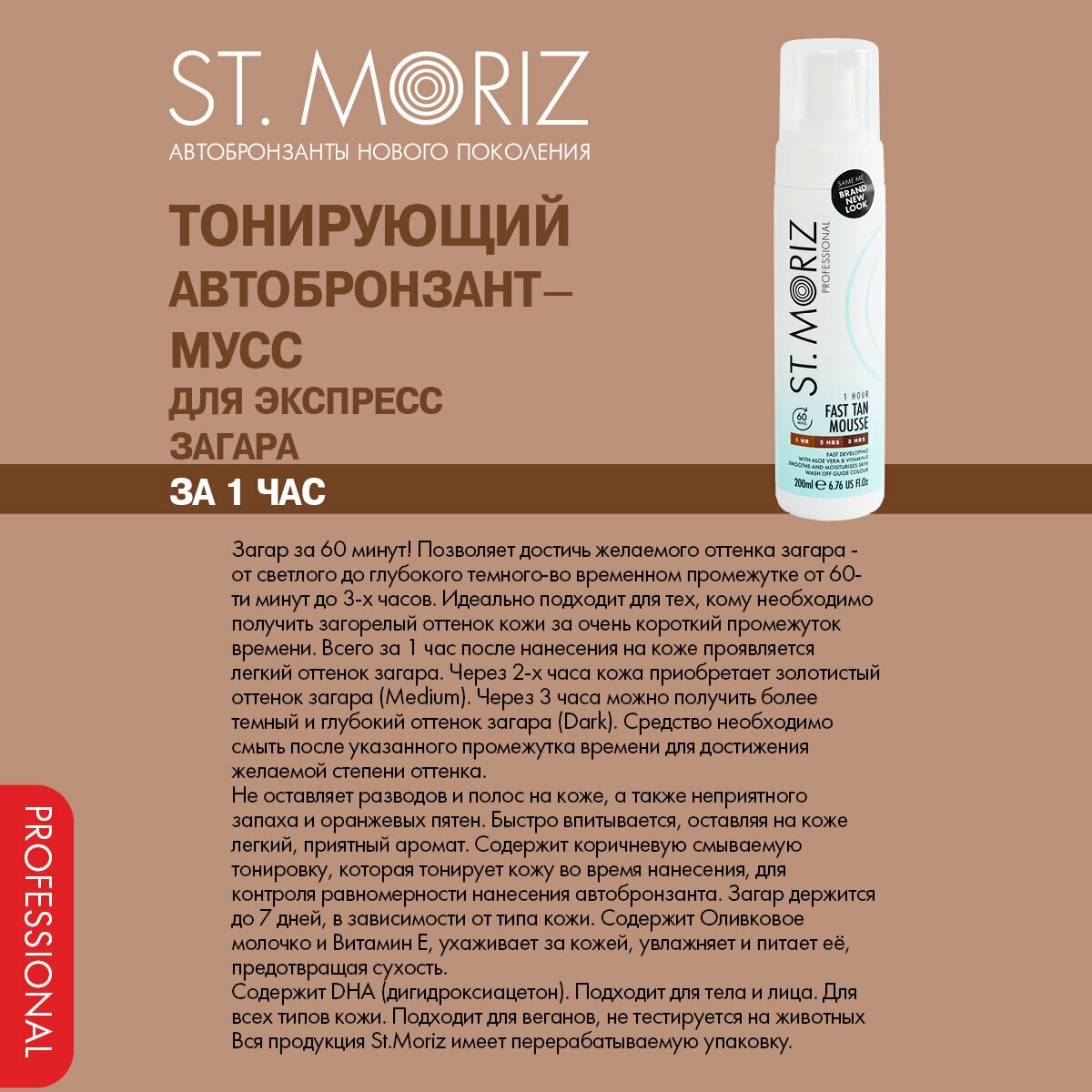 ST.Moriz Тонирующий профессиональный автобронзант мусс для экспресс загара за 1 час, естественный бронзовый загар, автозагар для тела и лица, бронзатор, 200 мл
