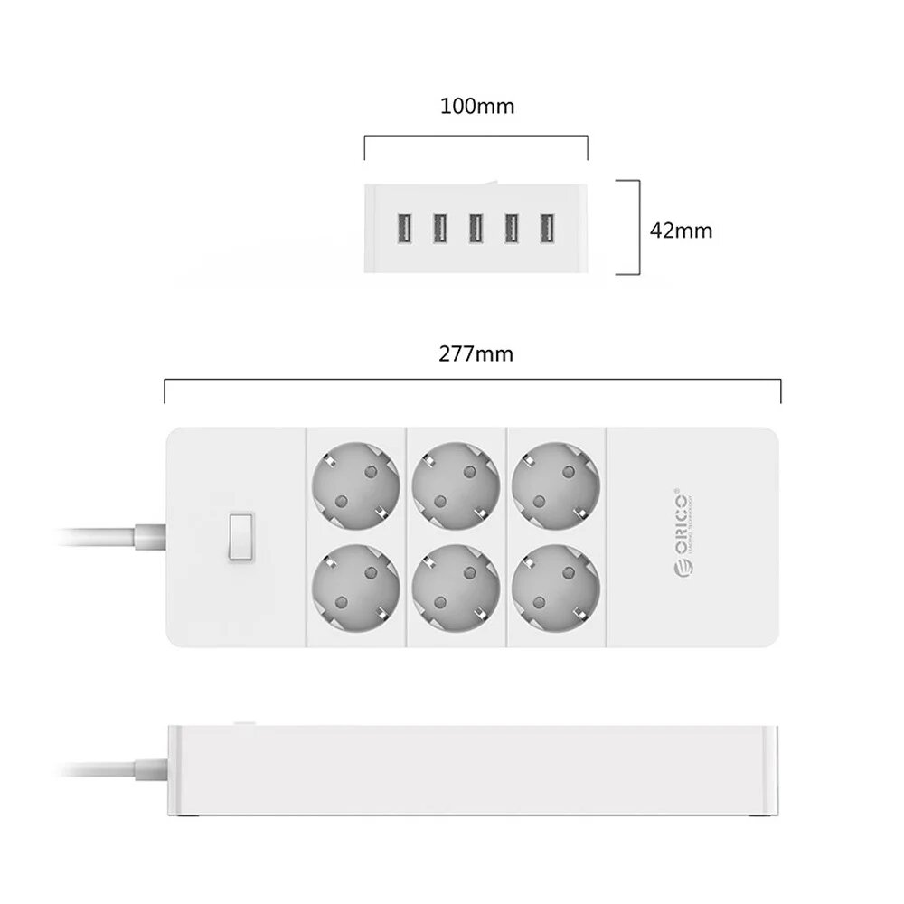 Сетевой фильтр ORICO HPC-6A5U, 6 розеток, с/з, 16А / 4000 Вт белый 1.5 м 277 мм 100 мм 42 мм 6 5