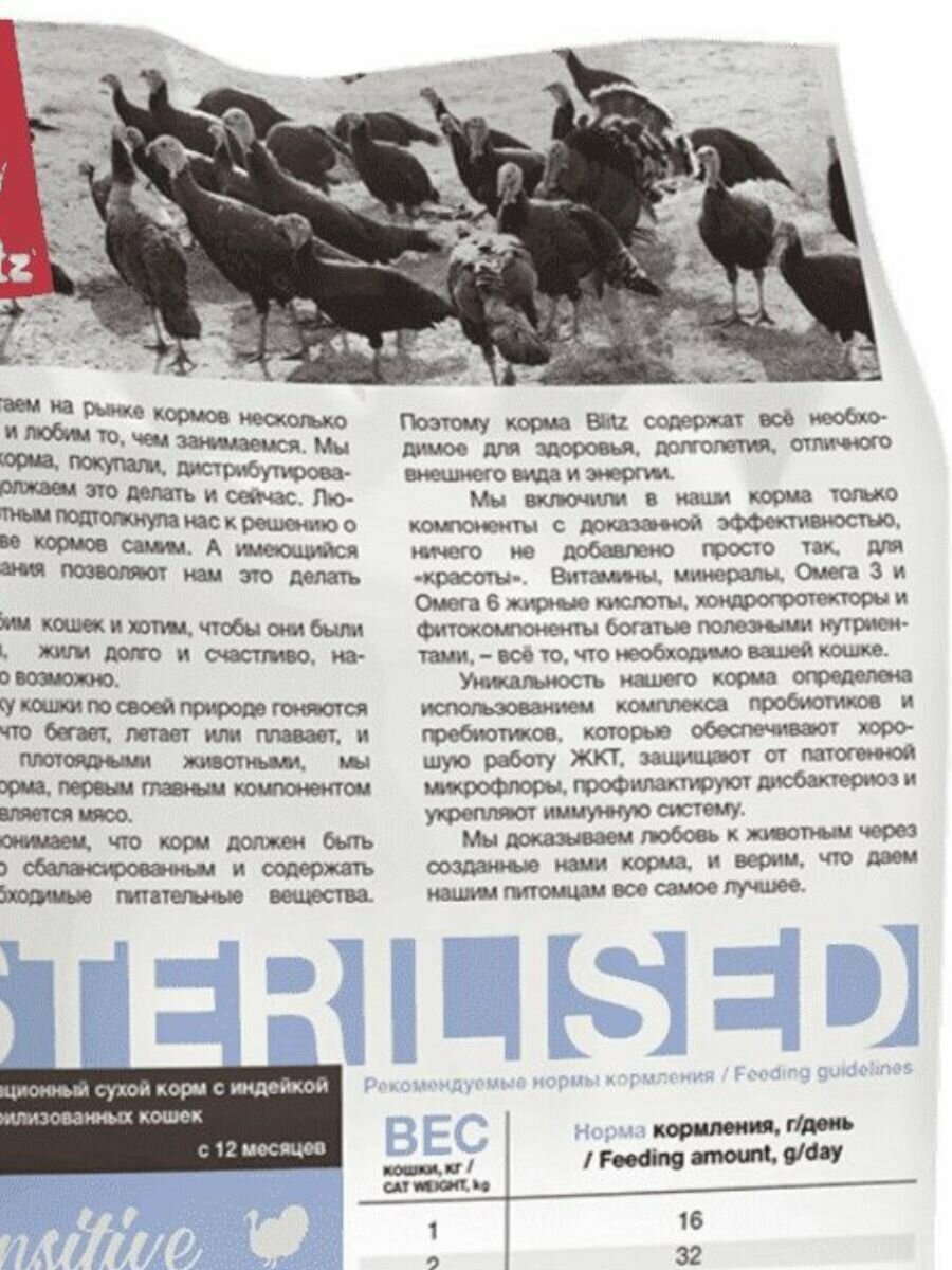 Blitz Sensitive Sterilised Cats полнорационный сухой корм для стерилизованных кошек, с индейкой