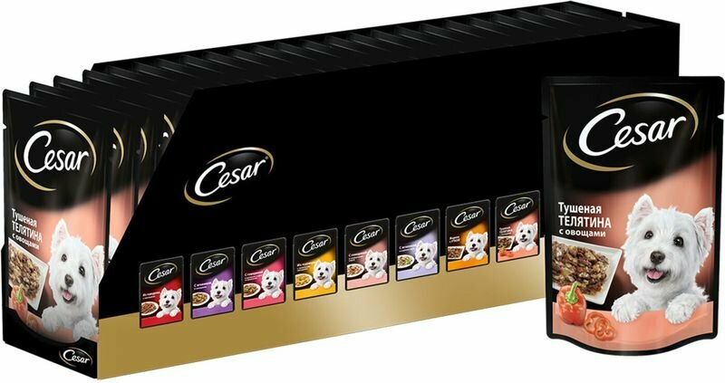 Cesar Паучи для взрослых собак, с тушеной телятиной и овощами в желе, 85г 10222849, 0,085 кг, 43492 (44 шт)