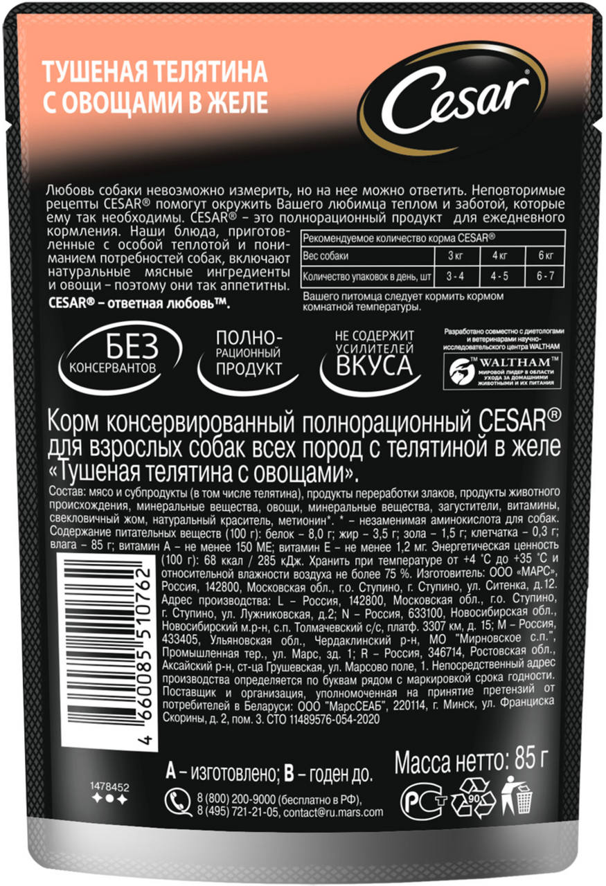 Cesar Паучи для взрослых собак, с тушеной телятиной и овощами в желе, 85г 10222849, 0,085 кг