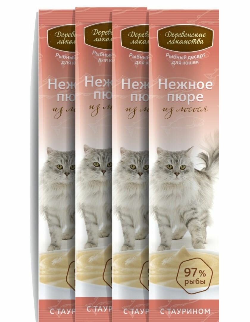 Деревенские лакомства "Нежное пюре из лосося" для кошек упаковка, 4 пакета по 10 гр