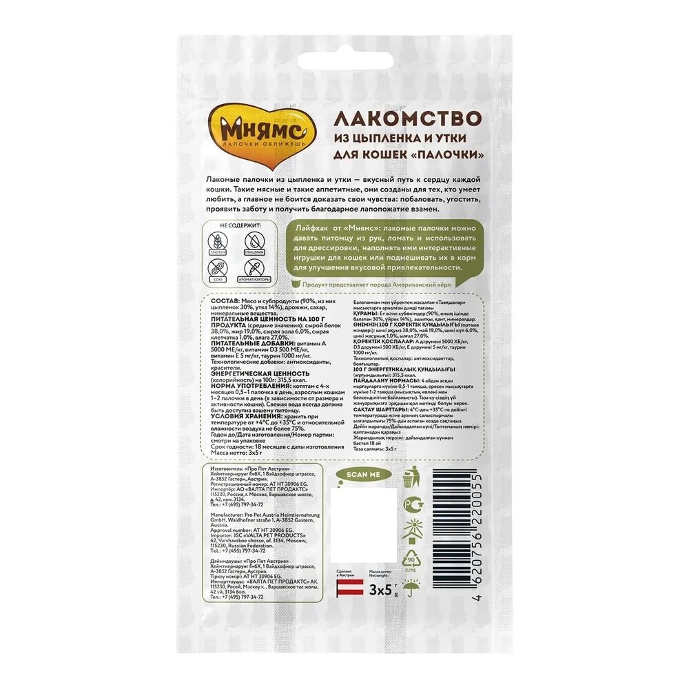 Лакомство для кошек Мнямс Лакомые палочки Цыпленок, утка, 5г х 3шт. в уп. 15 г