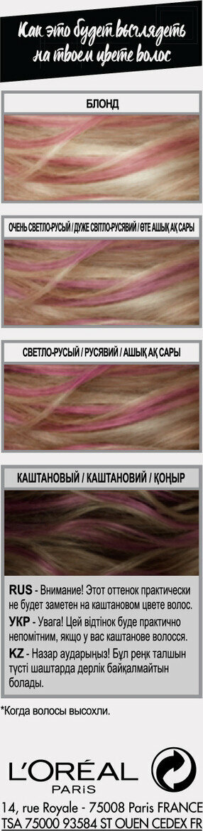 | Минусы: | Написанно сушить 10-20 мин, я сушила 30- 40 минут не высохли, для окрашивания нужно брать очень маленькие пряди, при расчёсывание краска слетает. Окрашивание не получилось. Так же написанно смывается шампунем, но на самом деле я пробовала смыть 2 раза, оттенок смылся, но остались розовие перламутровые крупицы, как розоаая перхоть. Даже врагу бы не посоветовала. Больше никогда не закажу. Прошу возврат денег |