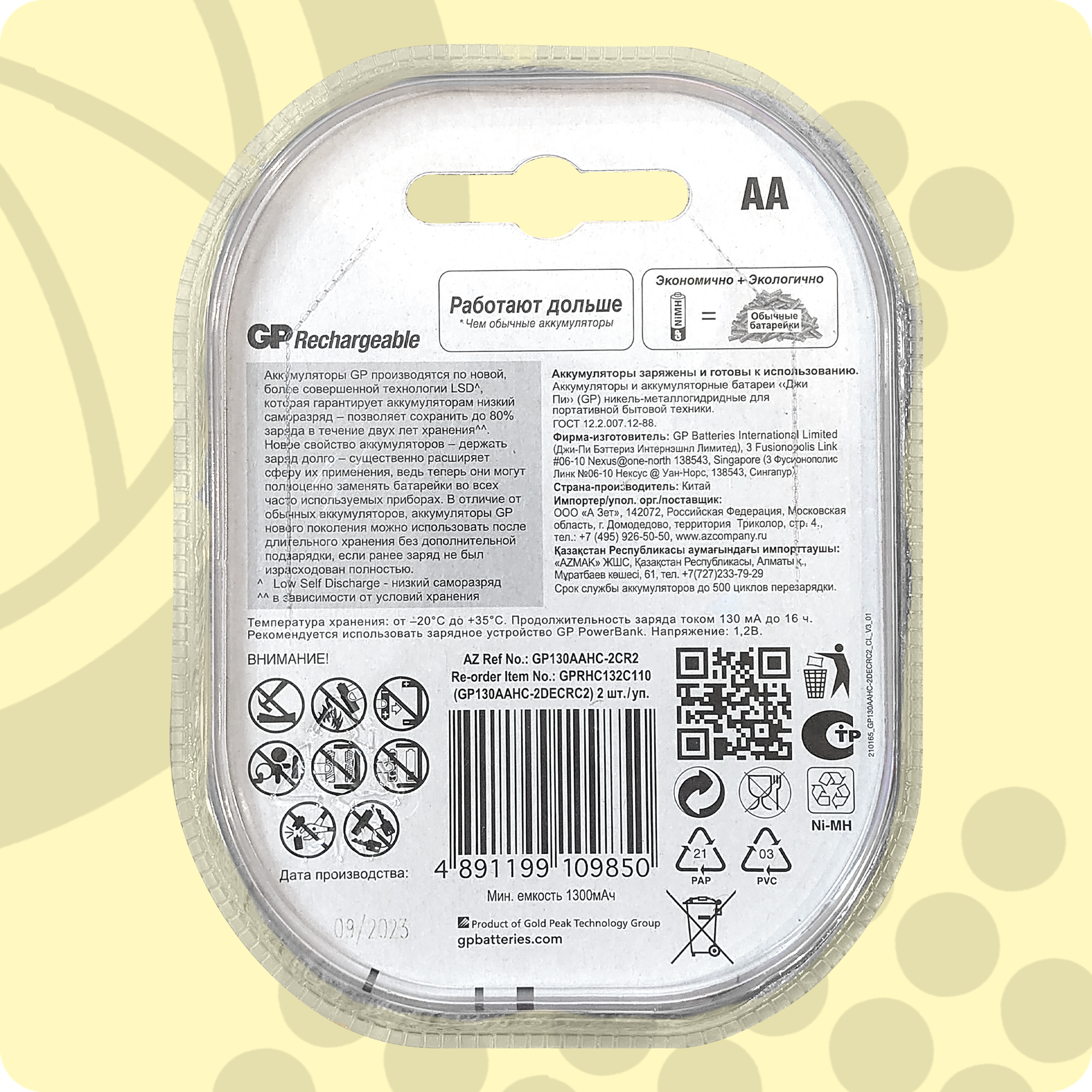 GP Перезаряжаемые аккумуляторы 130AAHC AA, емкость 1300 мАч - 2 шт. 130AAHC-2DECRC2