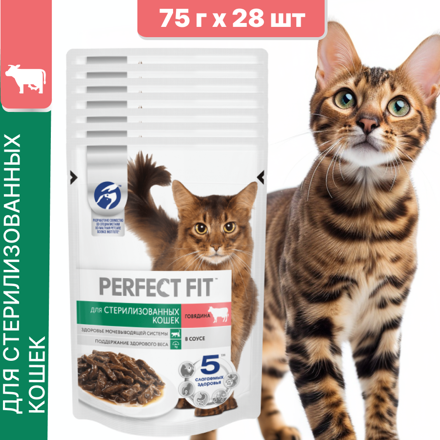 Влажный полнорационный корм Perfect Fit для стерилизованных кошек, говядина в соусе, 75г х 28шт