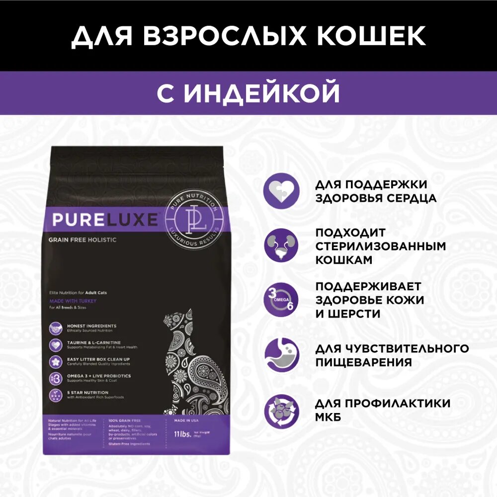 Сухой корм PureLuxe для взрослых котов кошек всех пород, со вкусом индейки, 5кг