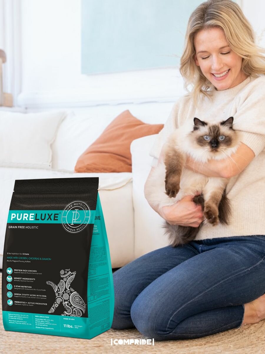 Сухой беззерновой корм PureLuxe Пурлюкс класса холистик для котят, а также беременных и кормящих кошек всех пород со свежей курицей, нутом и лососем, 1,5 кг.