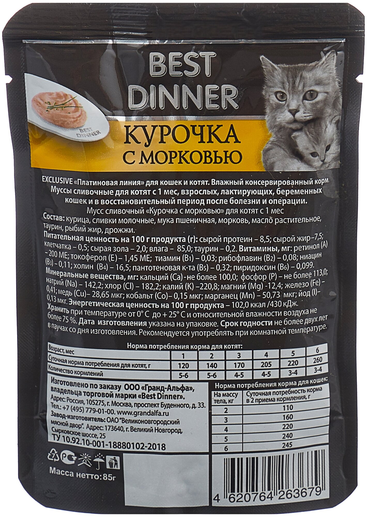Best Dinner Exclusive консервы для кошек и котят с 1 месяца мусс сливочный с курочкой и морковью пауч 24х85г