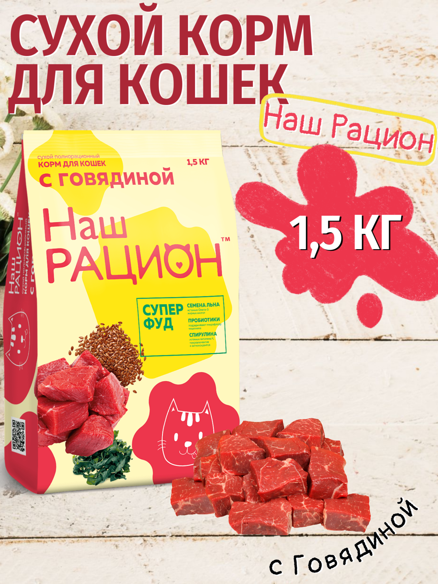 Сухой корм Наш рацион для кошек с говядиной, 1,5кг
