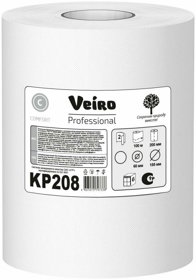 KP208 Бумажные полотенца в рулонах с центральной вытяжкой Veiro Professional Comfort белые двухслойные (6 рул х 100 м)