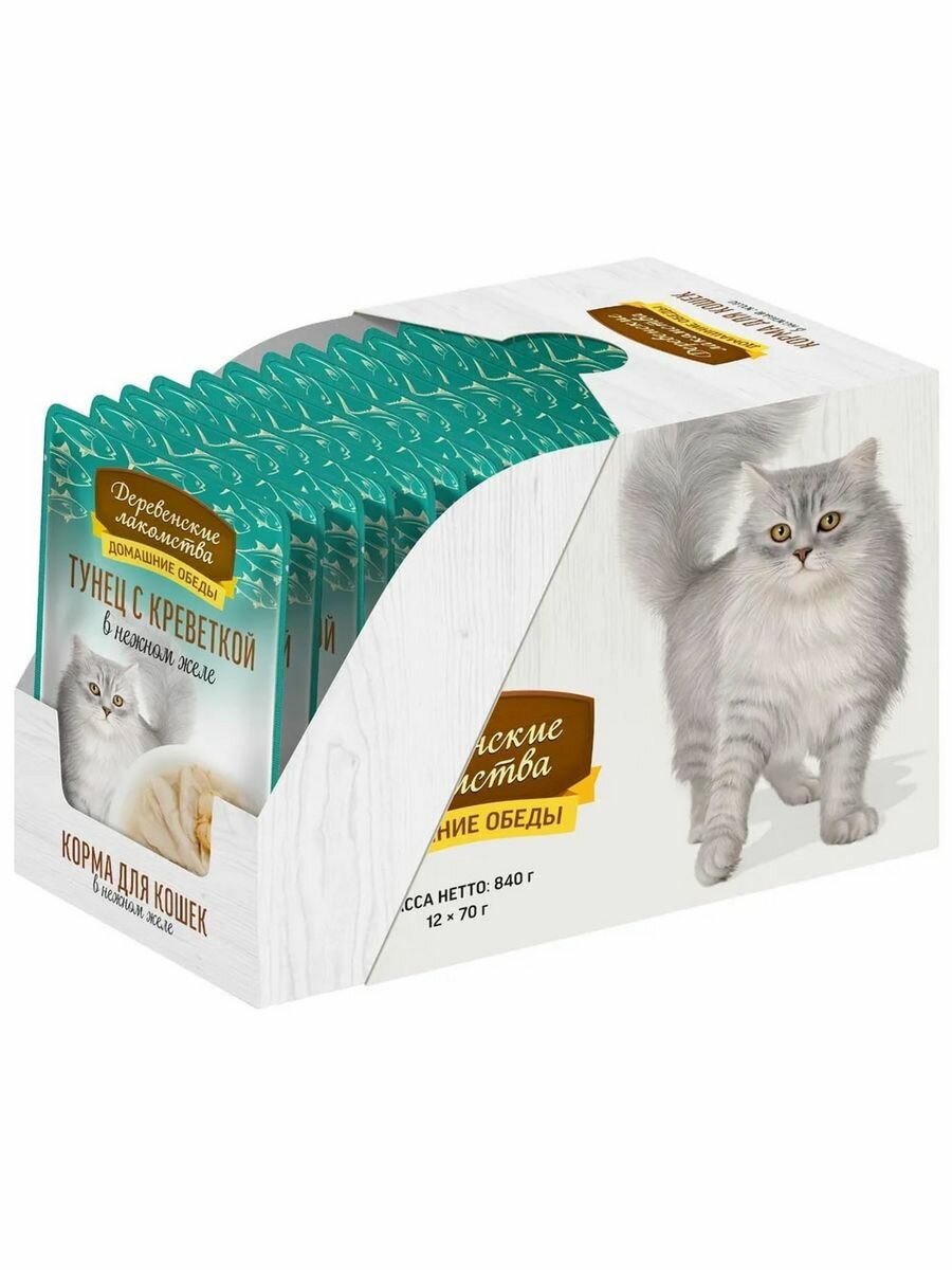 Деревенские лакомства домашние обеды для взрослых кошек с тунцом и креветкой в нежном желе 70 гр (70 гр х 12 шт)