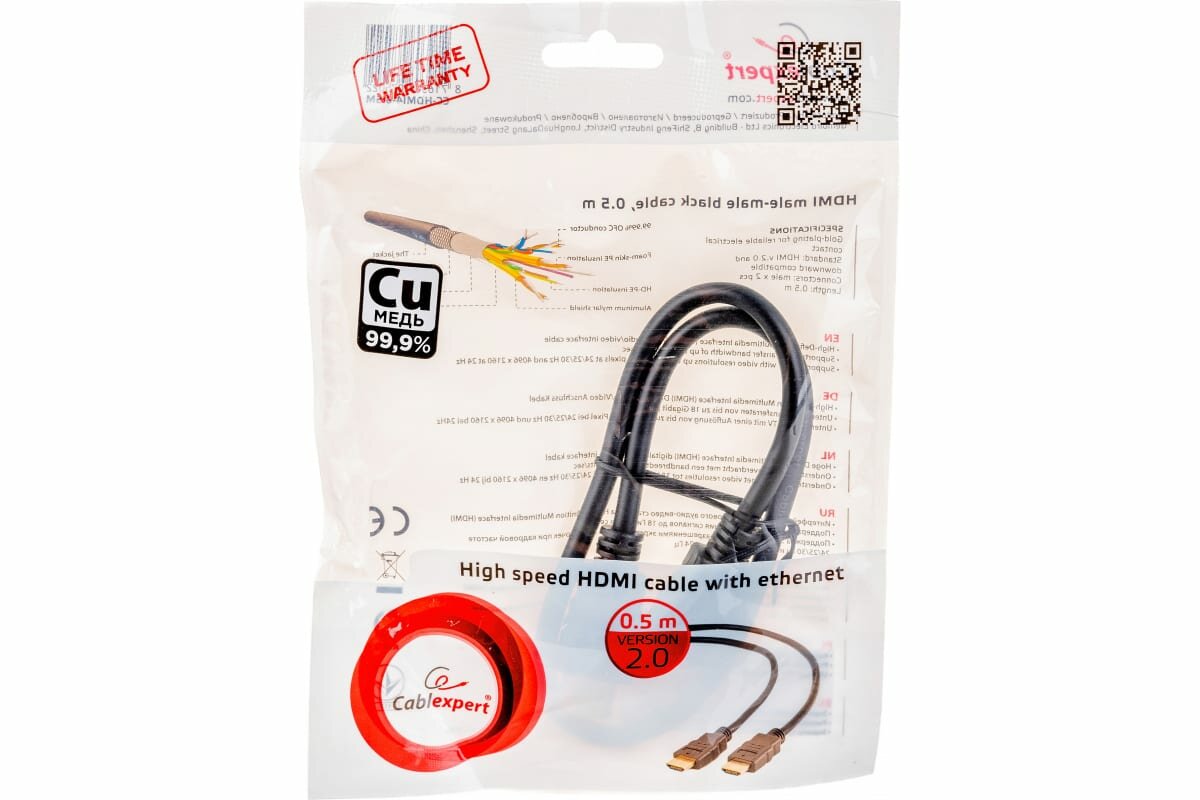 Купить Кабель HDMI Cablexpert, 0.5м, v2.0, 19M/19M, медь, позолоченные разъемы, экранировка, пакет, черный CC-HDMI4-0.5M