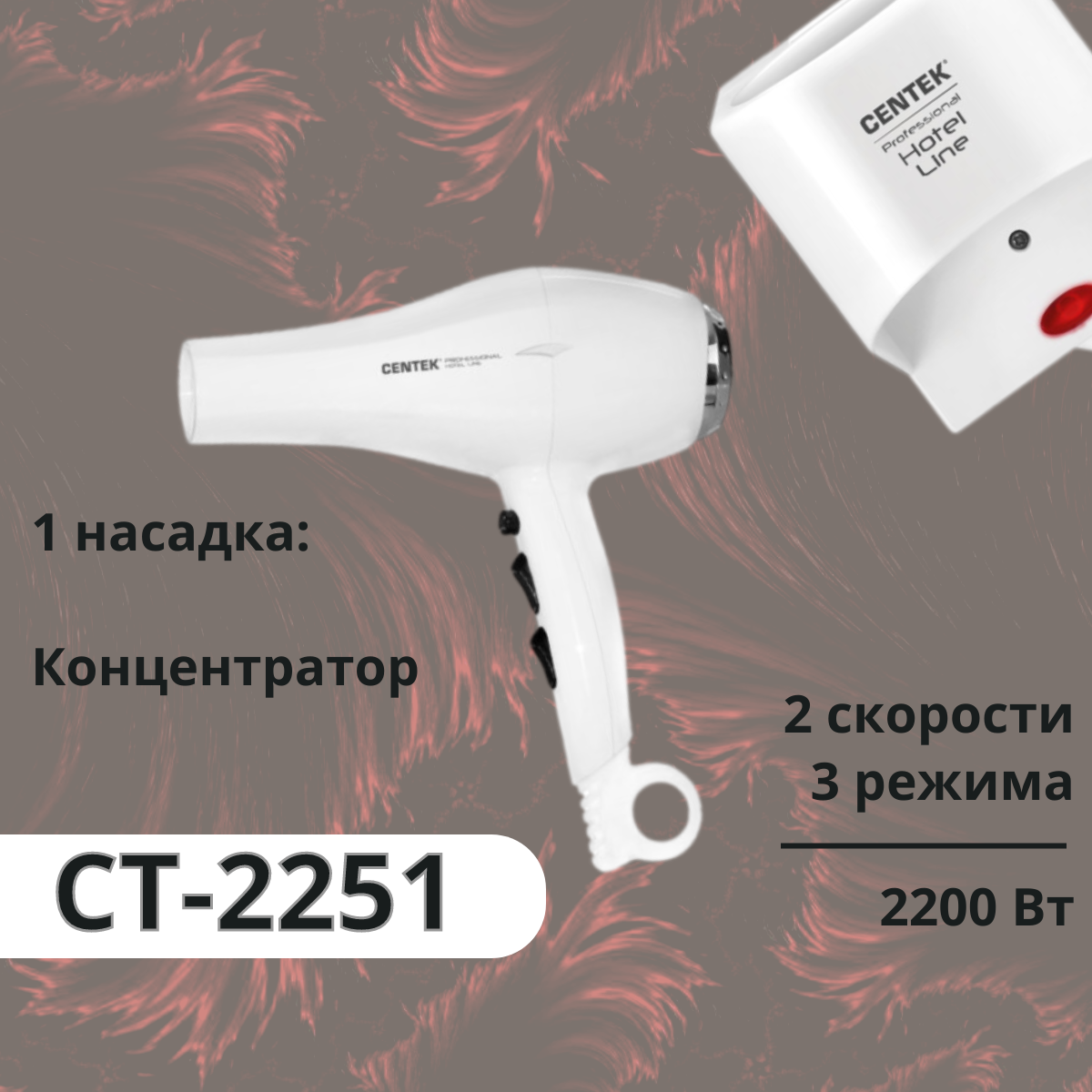 Фен Centek CT-2251 White 2100Вт <отельный> 2 режима мощности, 2 режима температуры + холодный обдув