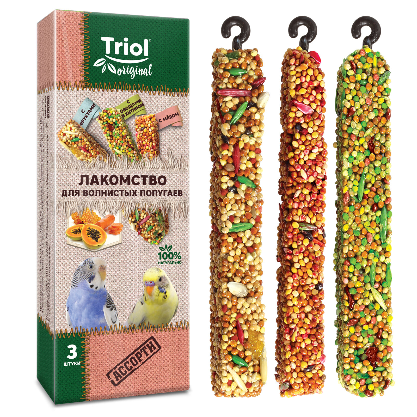 TRIOL™ Лакомство для волнистых попугаев ассорти (с фруктами, с овощами и хитином, с мёдом) Original