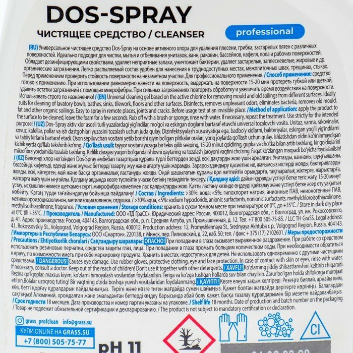 Универсальное чистящее средство GRASS Dos-spray Prof, щелочное, дезинфицирующее, 0,6 л